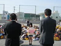 運動場に、今年度初めて全校児童が集まりました。登校児童全員が無事避難できました。